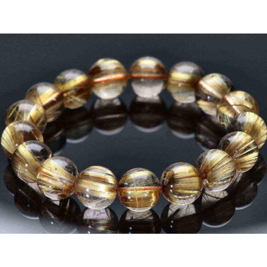 稀少なゴールドタイチンルチルクォーツを使用した天然石ブレスレット。神秘的な輝きを放つ深いゴールドカラーと、独特の繊細な模様が特徴です。この天然石は、自然界で生成される過程で珍しい結晶が組み合わさったものであり、その美しさとともにパワフルなエネルギーを持っています。